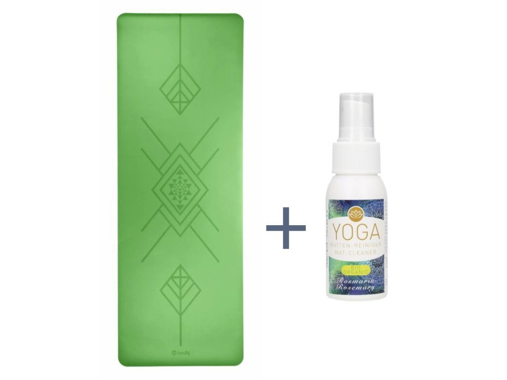 BODHI Jóga podložka PHOENIX Mat, Tribalign, 185 x 66 x 0,4 cm, zelená + YOGACLEANER Čistící sprej na podložky, 50 ml, rozmarýn