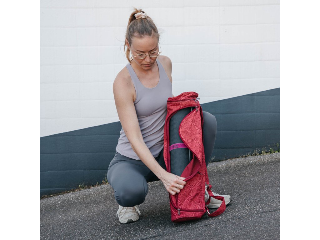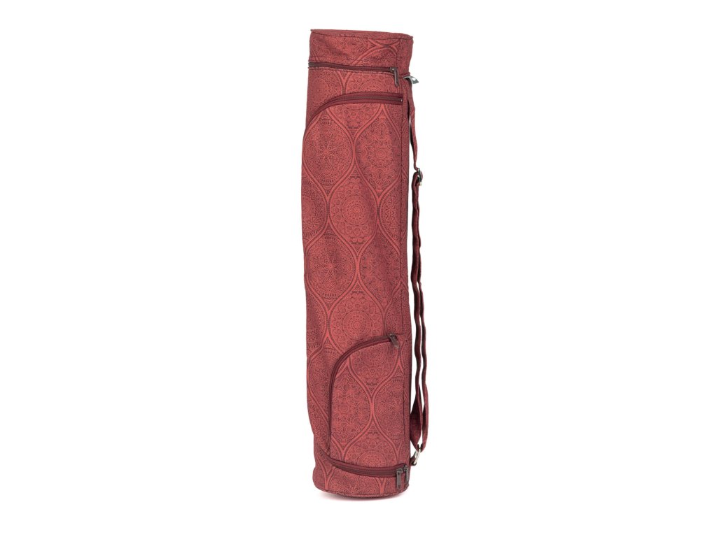 Vak na jógu z pevné bavlny s potiskem chrání podložku před vlhkostí a nečistotami při cestování. Praktické dvě kapsy na cennosti a jógové pomůcky zajistí pohodlné a bezpečné uložení. Ideální doplněk pro snadný transport vaší jógové výbavy.